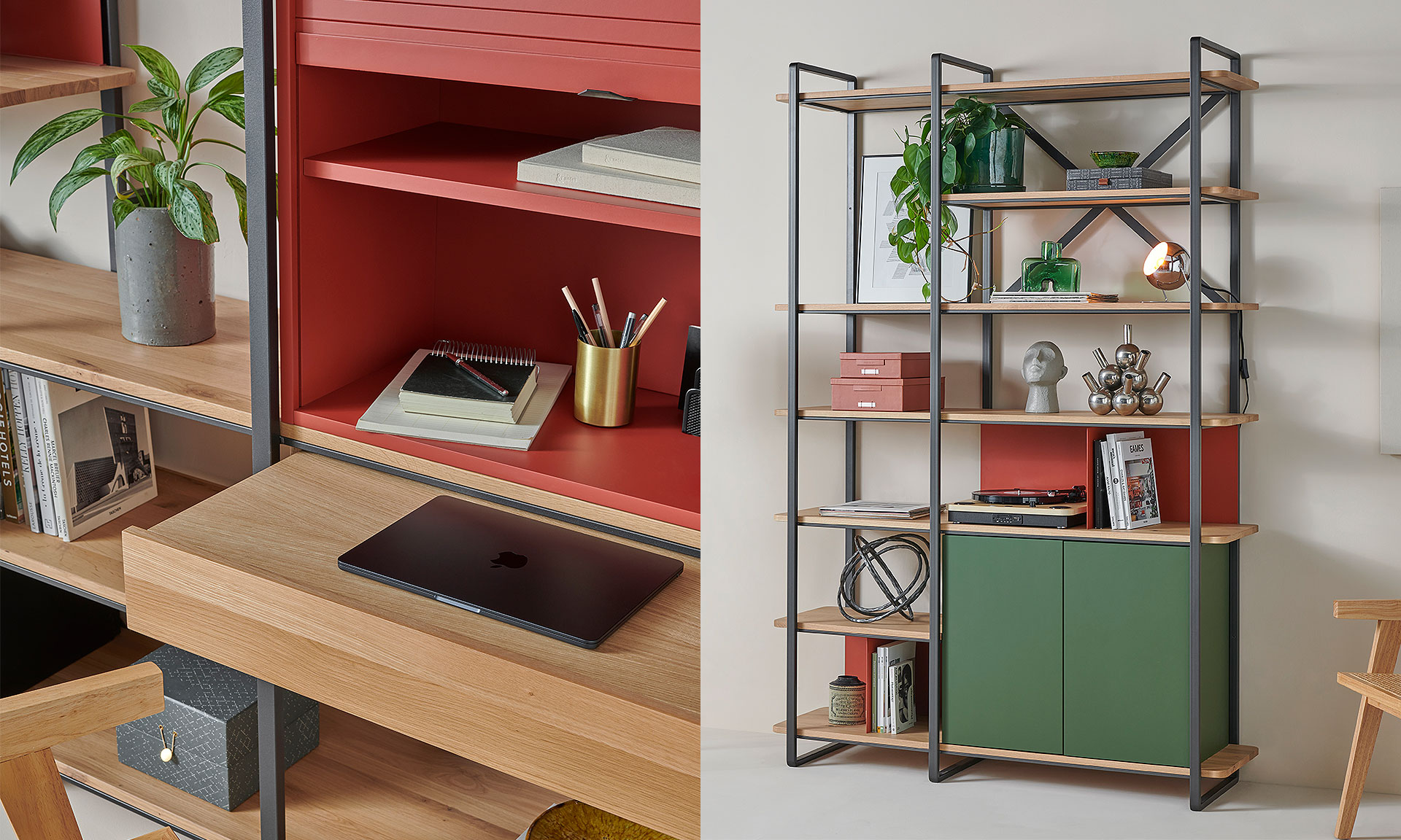 Bibliothèque structure métal. Tablettes chêne massif. Box de rangement et secrétaire MDF, médium, poignée zamac. Tiroir chêne massif, tablette coulissante panneau de particules plaqué chêne, coulisse chêne massif. Intercalaire métal.